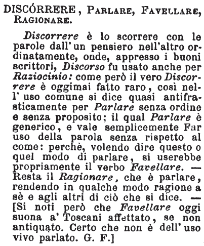 | Discorrere, Parlare, Favellare, Ragionare - Discorrere è lo scorrere con le parole dall'un pensiero nell'altro ordinatamente, onde, appresso i buoni scrittori, Discorso fu usato anche per Raziocinio: come però il vero Discorrere è oggimai fatto raro, così nell'uso comune si dice quasi antifrasticamente per Parlare senza ordine e senza proposito; il qual Parlare è generico, e vale semplicemente Far uso della parola senza rispetto al come: perchè, volendo dire questo o quel modo di parlare, si userebbe propriamente il verbo Favellare. - Resta il Ragionare, che è parlare, rendendo in qualche modo ragione a sè e agli altri di ciò che si dice. - [Si noti però che Favellare oggi suona a' Toscani affettato, se non antiquato. Certo che non è dell'uso vivo parlato. G. F.] [immagine] |