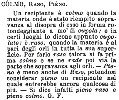 | Colmo, Raso, Pieno - Un recipiente è colmo quando la materia onde è stato riempito sopravanza al disopra di esso in forma rotondeggiante a mo' di cupola; e in certi luoghi lo dicono appunto cupolato: è raso, quando la materia è al pari degli orli in tutta la sua superficie. Per farlo raso talora si fa prima colmo e se ne rade poi via la parte che sopravanza agli orli. - Pieno è meno anche di Raso, potendosi considerar pieno un recipiente nel quale entrerebbe ancora qualcosa di più. - Si dice infatti pieno raso e pieno colmo. G. F. [immagine] |