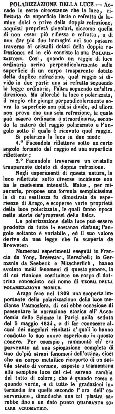 Si polarizza la luce in due modi: 1.° Facendola riflettere sotto un certo angolo formato dal raggio ed una superficie riflettente; 2.° Facendole traversare un cristallo trasparente dotato di doppia refrazione. Negli esperimenti di questa natura, la luce riflettuta sotto diverse incidenze non ha la medesima intensità. Malus, per misurarla, propose una formula semplicissima la di cui esattezza fu dimostrata da esperienze di Arago, e scoperse varie proprietà della luce polarizzata, le quali fanno epoca nella storia de' progressi della fisica. La polarizzazione della luce può essere prodotta da tutte le sostanze diafane; l'angolo soltanto è variabile, ed il suo valore deriva da una legge che fu scoperta da Brewster. Numerosi esperimenti eseguiti in Francia da Yong, Brewster, Herschell; in Germania da Seebeck e Mitscherlich, hanno svelato molti fenomeni di questo genere, la di cui riunione costituisce un corpo di dottrina conosciuto col nome di teoria della polarizzazione mobile. Arago fece nel 1809 una scoperta importante della polarizzazione della luce mediante l'atmosfera, di cui ebbe occasione di presentare la narrazione storica all'Accademia delle Scienze in Parigi nella seduta del 5 maggio 1834, e di far conoscere alcuni dei singolari risultati a' quali lo hanno condotto le sue nuove esperienze in questo genere. Per esempio, rammentò ch'era pervenuto ad una spiegazione completa di uno de' più strani fenomeni dell'ottica, cioè: che un corpo metallico ricoperto di un sottile strato di vernice, esposto a tramontana alla semplice luce del ciel sereno cambia del tutto di colore; che è quando rosso e quando verde, e di tutte le gradazioni intermedie fra quelle secondo l'ora dell'osservazione, dimodochè una tal piastra sarebbe fino a un dato punto quadrante solare acromatico. [immagine] |