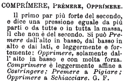 | Comprimere, Premere, Opprimere - Il primo par più forte del secondo, e dice una pressione eguale da più parti o da tutte o in tutta la massa, il che non è del secondo. Si può Premere dall'alto in basso, dal basso in alto e dai lati, e leggermente e fortemente; Opprimere, solamente dall'alto in basso e con molta forza. Comprimere è leggermente affine a Costringere; Premere a Pigiare; Opprimere a Schiacciare. G. F. [immagine] |