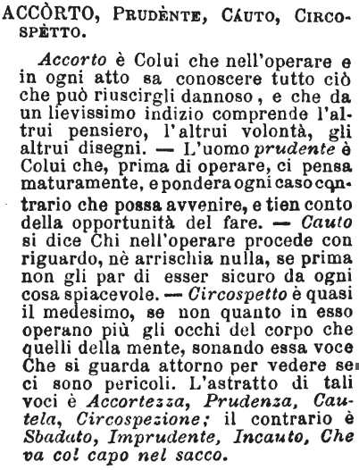 Accorto, Prudente, Cauto, Circospetto - Accorto è Colui che nell'operare e in ogni atto sa conoscere tutto ciò che può riuscirgli dannoso, e che da un lievissimo indizio comprende l'atrui pensiero, l'altrui volontà, gli altrui disegni. - L'uomo prudente è Colui che, prima di operare, ci pensa maturamente, e pondera ogni caso contrario che possa avvenire, e tien conto della opportunità del fare. - Cauto si dice Chi nell'operare procede con riguardo, nè arrischia nulla, se prima non gli par di esser sicuro da ogni cosa spiacevole. - Circospetto è quasi il medesimo, se non quanto in esso operano più gli occhi del corpo che quelli della mente, sonando essa voce Che si guarda attorno per vedere se ci sono pericoli. L'astratto di tali voci è Accortezza, Prudenza, Cautela, Circospezione; il contrario è Sbadato, Imprudente, Incauto, Che va col capo nel sacco. [immagine]