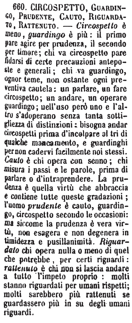 Circospetto, Guardingo, Prudente, Cauto, Riguardato, Rattenuto - Circospetto è meno, guardingo è più: il primo pare agire per prudenza, il secondo per timore; chi va circospetto pare fidarsi di certe precauzioni anteposte e generali; chi va guardingo, ognor teme, non ostante ogni preventiva cautela: un parlare, un fare circospetto; un andare, un operare guardingo; nell'uso però uno e l'altro s'adoperano senza tanta sottigliezza di distinzioni: bisogna andar circospetti prima d'incolpare altri di qualche mancamento, e guardinghi per non cadervi facilmente noi stessi. Cauto è chi opera con senno; chi misura i passi e le parole, prima di parlare o d'intraprendere. La prudenza è quella virtù che abbraccia e contiene tutte queste gradazioni; l'uomo prudente è cauto, guardingo, circospetto secondo le occasioni: ma siccome la prudenza è vera virtù, non esagera e non degenera in timidezza e pusillanimità. Riguardato chi opera nulla o meno di quel che potrebbe, per certi riguardi: rattenuto è chi non si lascia andare a tutto l'impeto proprio: molti stanno riguardati per umani rispetti; molti sarebbero più rattenuti se guardassero più in su degli umani riguardi. [immagine]