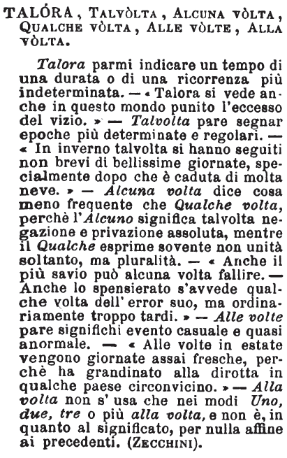 | Talora, Talvolta, Alcuna volta, Qualche volta, Alle volte, Alla volta - Talora parmi indicare un tempo di una durata o di una ricorrenza più indeterminata. - «Talora si vede anche in questo mondo punito l'eccesso del vizio.» - Talvolta pare segnar epoche più determinate e regolari. - «In inverno talvolta si hanno seguiti non brevi di bellissime giornate, specialmente dopo che è caduta di molta neve.» - Alcuna volta dice cosa meno frequente che Qualche volta, perchè l'Alcuno significa talvolta negazione e privazione assoluta, mentre il Qualche esprime sovente non unità soltanto, ma pluralità. - «Anche il più savio può alcuna volta fallire. - Anche lo spensierato s'avvede qualche volta dell'error suo, ma ordinariamente troppo tardi.» - Alle volte pare significhi evento casuale e quasi anormale. - «Alle volte in estate vengono giornate assai fresche, perchè ha grandinato alla dirotta in qualche paese circonvicino.» - Alla volta non s'usa che nei modi Uno, due, tre o più alla volta, e non è, in quanto al significato, per nulla affine ai precedenti. (Zecchini). [immagine] |