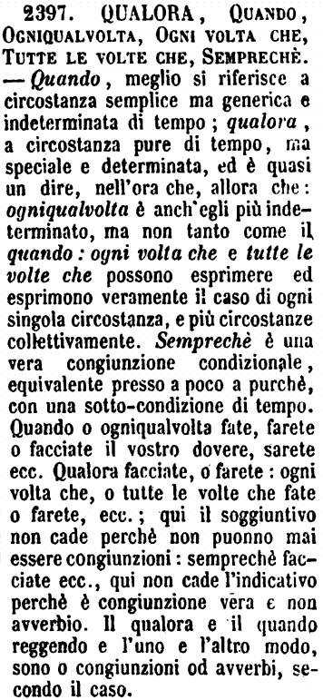 | Qualora, Quando, Ogniqualvolta, Ogni volta che, Tutte le volte che, Sempreché - Quando, meglio si riferisce a circostanza semplice ma generica e indeterminata di tempo; qualora, a circostanza pure di tempo, ma speciale e determinata, ed è quasi un dire, nell'ora che, allora che: ogniqualvolta è anch'egli più indeterminato, ma non tanto come il quando: ogni volta che e tutte le volte che possono esprimere ed esprimono veramente il caso di ogni singola circostanza, e più circostanze collettivamente. Semprechè è una vera congiunzione condizionale, equivalente presso a poco a purchè, con una sotto-condizione di tempo. Quando o ogniqualvolta fate, farete o facciate il vostro dovere, sarete ecc. Qualora facciate, o farete: ogni volta che, o tutte le volte che fate o farete, ecc.; qui il soggiuntivo non cade perchè non puonno mai essere congiunzioni: semprechè facciate ecc., qui non cade l'indicativo perchè è congiunzione vera e non avverbio. Il qualora e il quando reggendo e l'uno e l'altro modo, sono o congiunzioni od avverbi, secondo il caso. [immagine] |