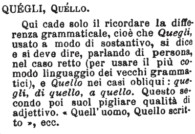 | Quegli, Quello - Qui cade solo il ricordare la differenza grammaticale, cioè che Quegli, usato a modo di sostantivo, si dice e si deve dire, parlando di persona, nel caso retto (per usare il più comodo linguaggio dei vecchi grammatici), e Quello nei casi obliqui: quegli, di quello, a quello. Questo secondo poi suol pigliare qualità di adjettivo. «Quell'uomo, Quello scritto», ecc. [immagine] |