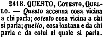 | Questo, Cotesto, Quello - Questo accenna cosa vicina a chi parla; cotesto cosa vicina a chi si parla; quello, cosa lontana e da chi parla e da colui al quale si parla. [immagine] |