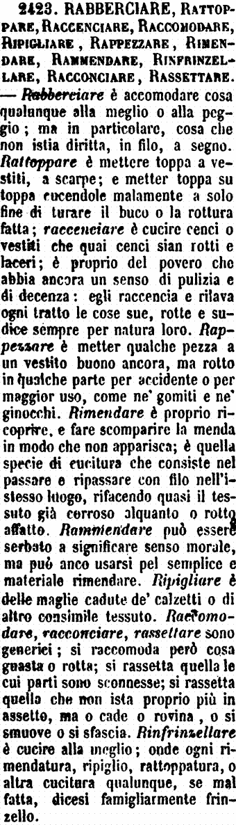 | Rabberciare, Rattoppare, Raccenciare, Raccomodare, Ripigliare, Rappezzare, Rimendare, Rammendare, Rinfrinzellare, Racconciare, Rassettare - Rabberciare è accomodare cosa qualunque alla meglio o alla peggio; ma in particolare, cosa che non istia diritta, in filo, a segno. Rattoppare è mettere toppa a vestiti, a scarpe; e metter toppa su toppa cucendole malamente a solo fine di turare il buco o la rottura fatta; raccenciare è cucire cenci o vestiti che quai cenci sian rotti e laceri; è proprio del povero che abbia ancora un senso di pulizia e di decenza: egli raccencia e rilava ogni tratto le cose sue, rotte e sudice sempre per natura loro. Rappezzare è metter qualche pezza a un vestito buono ancora, ma rotto in qualche parte per accidente o per maggior uso, come ne' gomiti e ne' ginocchi. Rimendare è proprio ricoprire, e fare scomparire la menda in modo che non apparisca; è quella specie di cucitura che consiste nel passare e ripassare con filo nell'istesso luogo, rifacendo quasi il tessuto già corroso alquanto o rotto affatto. Rammendare può essere serbato a significare senso morale, ma può anco usarsi pel semplice e materiale rimendare. Ripigliare è delle maglie cadute de' calzetti o di altro consimile tessuto. Raccomodare, racconciare, rassettare sono generici; si raccomoda però cosa guasta o rotta; si rassetta quella le cui parti sono sconnesse; si rassetta quella che non ista proprio più in assetto, ma o cade o rovina, o si smuove o si sfascia. Rinfrinzellare è cucire alla meglio; onde ogni rimendatura, ripiglio, rattoppatura, o altra cucitura qualunque, se mal fatta, dicesi famigliarmente frinzello. [immagine] |
