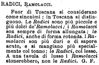 Radici, Ramolacci - Fuor di Toscana si considerano come sinonimi: in Toscana si distinguono. Le Radici sono più piccole e più dolci de'Ramolacci; i Ramolacci son sempre di forma allungata; le Radici, anche di forma rotonda. I Ramolacci son più duri e di sapore acuto, e si mangiano più specialmente col tonno; le Radici, col lesso. A una tavola di lusso i Ramolacci stonerebbero, non le Radici. G. F. [immagine]