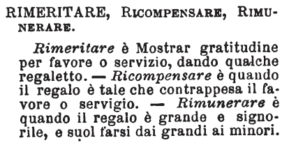 | Rimeritare, Ricompensare, Rimunerare - Rimeritare è Mostrar gratitudine per favore o servizio, dando qualche regaletto. - Ricompensare è quando il regalo è tale che contrappesa il favore o servigio. - Rimunerare è quando il regalo è grande e signorile, e suol farsi dai grandi ai minori. [immagine] |