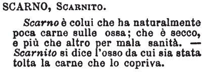 | Scarno, Scarnito - Scarno è colui che ha naturalmente poca carne sulle ossa; che è secco, e più che altro per mala sanità. - Scarnito si dice l'osso da cui sia stata tolta la carne che lo copriva. [immagine] |