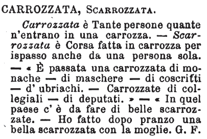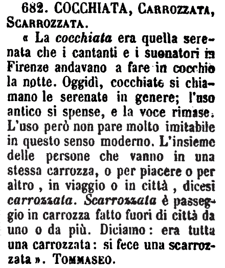 | Cocchiata, Carrozzata, Scarrozzata - «La cocchiata era quella serenata che i cantanti e i suonatori in Firenze andavano a fare in cocchio la notte. Oggidì, cocchiate si chiamano le serenate in genere; l'uso antico si spense, e la voce rimase. L'uso però non pare molto imitabile in questo senso moderno. L'insieme delle persone che vanno in una stessa carrozza, o per piacere o per altro, in viaggio o in città, dicesi carrozzata. Scarrozzata è passeggio in carrozza fatto fuori di città da uno o da più. Diciamo: era tutta una carrozzata: si fece una scarrozzata». Tommaseo. [immagine] |