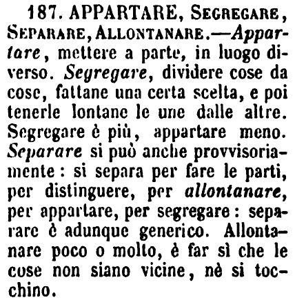 | Appartare, Segregare, Separare, Allontanare - Appartare, mettere a parte, in luogo diverso. Segregare, dividere cose da cose, fattane una certa scelta, e poi tenerle lontane le une dalle altre. Segregare è più, appartare meno. Separare si può anche provvisoriamente: si separa per fare le parti, per distinguere, per allontanare, per appartare, per segregare: separare è adunque generico. Allontanare poco o molto, è far sì che le cose non siano vicine, nè si tocchino. [immagine] |