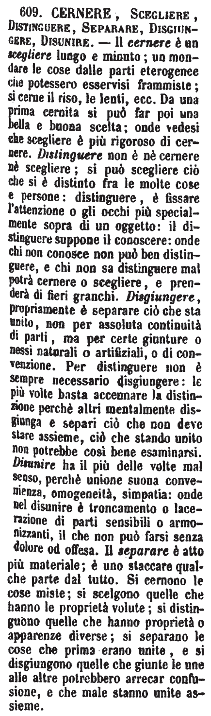 | Cernere, Scegliere, Distinguere, Separare, Disgiungere, Disunire - Il cernere è un scegliere lungo e minuto; un mondare le cose dalle parti eterogenee che potessero esservisi frammiste; si cerne il riso, le lenti, ecc. Da una prima cernita si può far poi una bella e buona scelta; onde vedesi che scegliere è più rigoroso di cernere. Distinguere non è nè cernere nè scegliere; si può scegliere ciò che si è distinto fra le molte cose e persone: distinguere, è fissare l'attenzione o gli occhi più specialmente sopra di un oggetto: il distinguere suppone il conoscere: onde chi non conosce non può ben distinguere, e chi non sa distinguere mal potrà cernere o scegliere, e prenderà di fieri granchi. Disgiungere, propriamente è separare ciò che sta unito, non per assoluta continuità di parti, ma per certe giunture o nessi naturali o artifiziali, o di convenzione. Per distinguere non è sempre necessario disgiungere: le più volte basta accennare la distinzione perchè altri mentalmente disgiunga e separi ciò che non deve stare assieme, ciò che stando unito non potrebbe così bene esaminarsi. Disunire ha il più delle volte mal senso, perchè unione suona convenienza, omogeneità, simpatia: onde nel disunire è troncamento o lacerazione di parti sensibili o armonizzanti, il che non può farsi senza dolore od offesa. Il separare è atto più materiale; è uno staccare qualche parte dal tutto. Si cernono le cose miste; si scelgono quelle che hanno le proprietà volute; si distinguono quelle che hanno proprietà o apparenze diverse; si separano le cose che prima erano unite, e si disgiungono quelle che giunte le une alle altre potrebbero arrecar confusione, e che male stanno unite assieme. [immagine] |