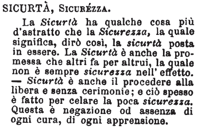 Sicurtà, Sicurezza - La Sicurtà ha qualche cosa più d'astratto che la Sicurezza, la quale significa, dirò così, la sicurtà posta in essere. La Sicurtà è anche la promessa che altri fa per altrui, la quale non è sempre sicurezza nell'effetto. - Sicurtà è anche il procedere alla libera e senza cerimonie; e ciò spesso è fatto per celare la poca sicurezza. Questa è negazione od assenza di ogni cura, di ogni apprensione. [immagine]