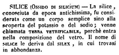 Silice (ossido di silicium) - La silice, conosciuta da epoca antichissima, fu considerata come un corpo semplice sino alla scoperta del potassio e del sodio; venne chiamata terra vetrificabile, perchè entra nella composizione del vetro. Il nome di silice le deriva dal silex, in cui trovasi in abbondanza. [immagine]
