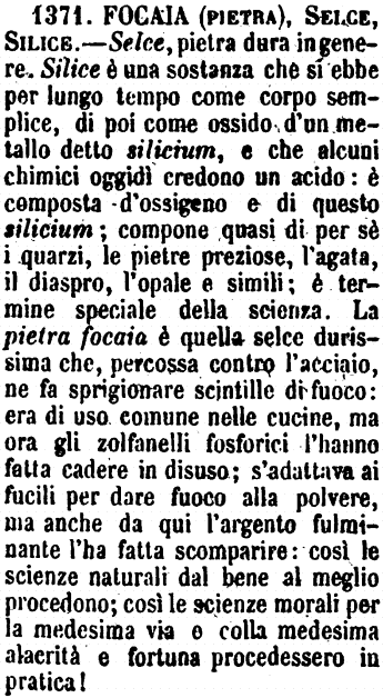 Focaia (pietra), Selce, Silice - Selce, pietra dura in genere. Silice è una sostanza che si ebbe per lungo tempo come corpo semplice, di poi come ossido d'un metallo detto silicium, e che alcuni chimici oggidì credono un acido: è composta d'ossigeno e di questo silicium; compone quasi di per sè i quarzi, le pietre preziose, l'agata, il diaspro, l'opale e simili; è termine speciale della scienza. La pietra focaia è quella selce durissima che, percossa contro l'acciaio, ne fa sprigionare scintille di fuoco: era di uso comune nelle cucine, ma ora gli zolfanelli fosforici l'hanno fatta cadere in disuso; s'adattava ai fucili per dare fuoco alla polvere, ma anche da qui l'argento fulminante l'ha fatta scomparire: così le scienze naturali dal bene al meglio procedono; così le scienze morali per la medesima via e colla medesima alacrità e fortuna procedessero in pratica! [immagine]