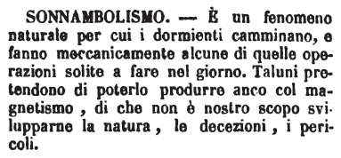 | Sonnambolismo - E' un fenomeno naturale per cui i dormienti camminano, e fanno meccanicamente alcune di quelle operazioni solite a fare nel giorno. Taluni pretendono di poterlo produrre anco col magnetismo, di che non è nostro scopo svilupparne la natura, le decezioni, i pericoli. [immagine] |