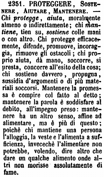 | Proteggere, Sostenere, Aiutare, Mantenere - Chi protegge, aiuta, moralmente almeno o indirettamente; chi mantiene, tien su, sostiene colle mani o con altro. Chi protegge efficacemente, difende, promuove, incoraggia, rimuove gli ostacoli; chi proprio aiuta, dà mano, soccorre, si presta, concorre all'esito della cosa; chi sostiene davvero, propugna, sussidia d'argomenti o di più materiali soccorsi. Mantenere la promessa è compire col fatto al detto; mantenere la parola è soddisfare al debito, all'impegno preso: mantenere ha un altro senso affine ad alimentare, ma è più di questo; poichè chi mantiene una persona l'alloggia, la veste e l'alimenta a sufficienza, invecechè l'alimentare non potrebbe, volendo, dire altro che dare un qualche alimento onde altri non morisse assolutamente di fame. [immagine] |