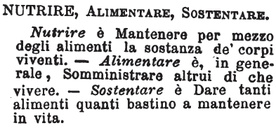 | Nutrire, Alimentare, Sostentare - Nutrire è Mantenere per mezzo degli alimenti la sostanza de' corpi viventi. - Alimentare è, in generale, Somministrare altrui di che vivere. - Sostentare è Dare tanti alimenti quanti bastino a mantenere in vita. [immagine] |