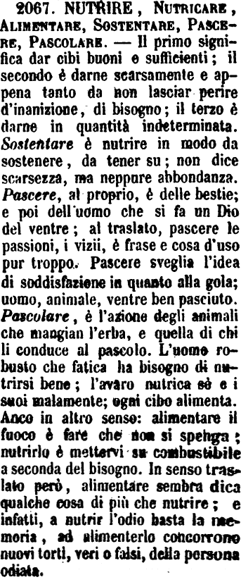 | Nutrire, Nutricare, Alimentare, Sostentare, Pascere, Pascolare - Il primo significa dar cibi buoni e sufficienti; il secondo è darne scarsamente e appena tanto da non lasciar perire d'inanizione, di bisogno; il terzo è darne in quantità indeterminata. Sostentare è nutrire in modo da sostenere, da tener su; non dice scarsezza, ma neppure abbondanza. Pascere, al proprio, è delle bestie; e poi dell'uomo che si fa un Dio del ventre; al traslato, pascere le passioni, i vizii, è frase e cosa d'uso pur troppo. Pascere sveglia l'idea di soddisfazione in quanto alla gola; uomo, animale, ventre ben pasciuto. Pascolare, è l'azione degli animali che mangian l'erba, e quella di chi li conduce al pascolo. L'uomo robusto che fatica ha bisogno di nutrirsi bene; l'avaro nutrica sè e i suoi malamente; ogni cibo alimenta. Anco in altro senso: alimentare il fuoco è fare che non si spenga; nutrirlo è mettervi su combustibile a seconda del bisogno. In senso traslato però, alimentare sembra dica qualche cosa di più che nutrire; e infatti, a nutrir l'odio basta la memoria, ad alimenterlo concorrono nuovi torti, veri o falsi, della persona odiata. [immagine] |