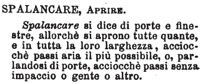 Spalancare, Aprire - Spalancare si dice di porte e finestre, allorchè si aprono tutte quante, e in tutta la loro larghezza, acciocchè passi aria il più possibile, o, parlandosi di porte, acciocchè passi senza impaccio o gente o altro. [immagine]
