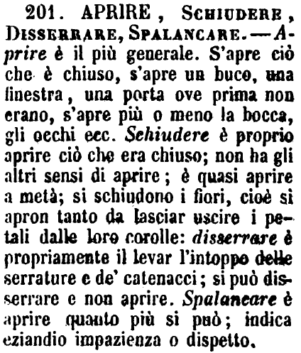 Aprire, Schiudere, Disserrare, Spalancare - Aprire è il più generale. S'apre ciò che è chiuso, s'apre un buco, una finestra, una porta ove prima non erano, s'apre più o meno la bocca, gli occhi ecc. Schiudere è proprio aprire ciò che era chiuso; non ha gli altri sensi di aprire; è quasi aprire a metà; si schiudono i fiori, cioè si apron tanto da lasciar uscire i petali dalle loro corolle: disserrare è propriamente il levar l'intoppo delle serrature e de' catenacci; si può disserrare e non aprire. Spalancare è aprire quanto più si può; indica eziandio impazienza o dispetto. [immagine]