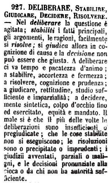 | Deliberare, Stabilire, Giudicare, Decidere, Risolvere - Nel deliberare la questione è agitata; stabiliti i fatti principali, gli argomenti, le ragioni, facilmente si risolve; si giudica allora in cognizione di causa e la decisione non può essere che giusta. A deliberare ci va tempo e pacatezza d'animo; a stabilire, accortezza e fermezza; a risolvere, cognizione e prudenza; a giudicare, rettitudine, studio sufficiente e imparzialità; a decidere, mente sintetica, colpo d'occhio fino ed esercitato, equità e mandato. Il male si è che il più delle volte le deliberazioni sono insufficienti o pregiudicate; che le cose stabilite non si eseguiscono; le risoluzioni sono o precipitate o imprudenti; i giudizii avventati, parziali o maligni, e le decisioni pronunziate alla cieca o da chi non ha autorità sufficiente. [immagine] |