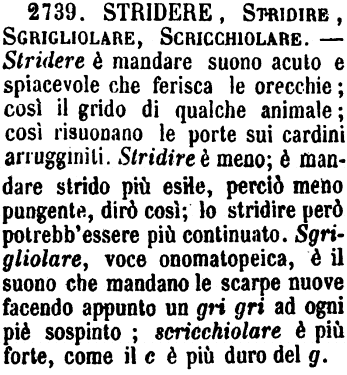 | Stridere, Stridire, Sgrigliolare, Scricchiolare - Stridere è mandare suono acuto e spiacevole che ferisca le orecchie; così il grido di qualche animale; così risuonano le porte sui cardini arrugginiti. Stridire è meno; è mandare strido più esile, perciò meno pungente, dirò così; lo stridire però potrebb'essere più continuato. Sgrigliolare, voce onomatopeica, è il suono che mandano le scarpe nuove facendo appunto un gri gri ad ogni piè sospinto; scricchiolare è più forte, come il c è più duro del g. [immagine] |