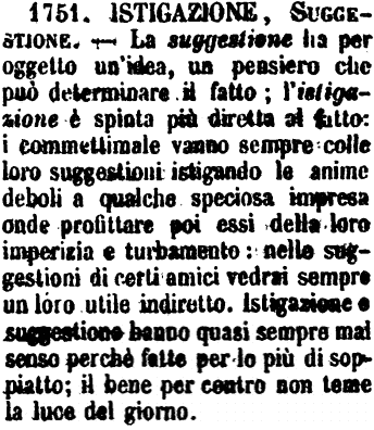 Istigazione, Suggestione - La suggestione ha per oggetto un'idea, un pensiero che può determinare il fatto; l'istigazione è spinta più diretta al fatto: i commettimale vanno sempre colle loro suggestioni istigando le anime deboli a qualche speciosa impresa onde profittare poi essi della loro imperizia e turbamento: nelle suggestioni di certi amici vedrai sempre un loro utile indiretto. Istigazione e suggestione hanno quasi sempre mal senso perchè fatte per lo più di soppiatto; il bene per contro non teme la luce del giorno. [immagine]