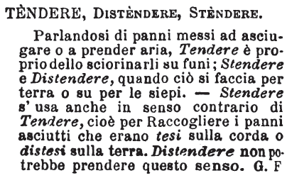 | Tendere, Distendere, Stendere - Parlandosi di panni messi ad asciugare o a prender aria, Tendere è proprio dello sciorinarli su funi; Stendere e Distendere, quando ciò si faccia per terra o su per le siepi. - Stendere s'usa anche in senso contrario di Tendere, cioè per Raccogliere i panni asciutti che erano tesi sulla corda o distesi sulla terra. Distendere non potrebbe prendere questo senso. G. F [immagine] |
