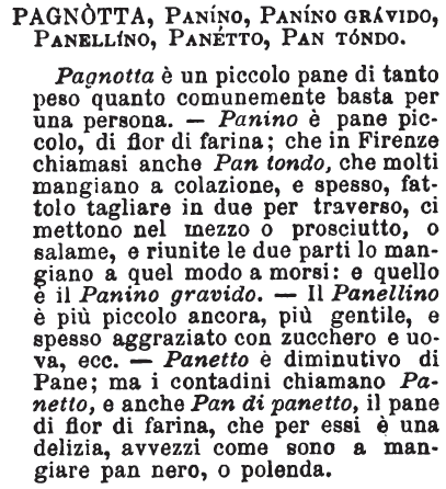Pagnotta, Panino, Panino gravido, Panellino, Panetto, Pan tondo - Pagnotta è un piccolo pane di tanto peso quanto comunemente basta per una persona. - Panino è pane piccolo, di fior di farina; che in Firenze chiamasi anche Pan tondo, che molti mangiano a colazione, e spesso, fattolo tagliare in due per traverso, ci mettono nel mezzo o prosciutto, o salame, e riunite le due parti lo mangiano a quel modo a morsi: e quello è il Panino gravido. - Il Panellino è più piccolo ancora, più gentile, e spesso aggraziato con zucchero e uova, ecc. - Panetto è diminutivo di Pane; ma i contadini chiamano Panetto, e anche Pan di panetto, il pane di fior di farina, che per essi è una delizia, avvezzi come sono a mangiare pan nero, o polenda. [immagine]