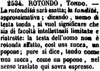 Rotondo, Tondo - La rotondità sarà esatta; la tondità, approssimativa; dicendo, uomo di testa tonda, si vuol significare che sia di facoltà intellettuali limitate e ristrette: la testa dell'uomo non è rotonda affatto, così una zucca, un popone; pure si dice, tondo come una zucca, come un popone, nel senso traslato qui sovra espresso. [immagine]