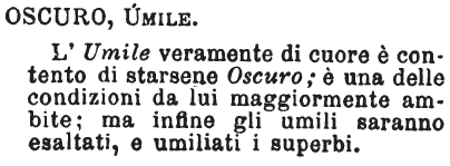 | Oscuro, Umile - L'Umile veramente di cuore è contento di starsene Oscuro; è una delle condizioni da lui maggiormente ambite; ma infine gli umili saranno esaltati, e umiliati i superbi. [immagine] |
