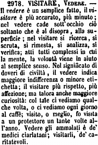 | Visitare, Vedere - Il vedere è un semplice fatto, il visitare è più accurato, più minuto; nel vedere cade sott'occhio ciò soltanto che è al disopra, alla superficie; nel visitare si ricerca, si scruta, si rimesta, si analizza, si verifica; atti tutti complessi in cui la mente, la volontà viene in aiuto al semplice senso. Nel significato di doveri di civiltà, il vedere indica maggiore indifferenza o minore etichetta; il visitare più rispetto, più affezione; ma talora anche maggiore curiosità: col tale ci vediamo qualche volta, o ci vediamo ogni giorno al caffè; visito, o meglio, fo visita a un protettore un tante volte all'anno. Vedere gli ammalati è de' medici ciarlatani; visitarli, de' caritatevoli. [immagine] |