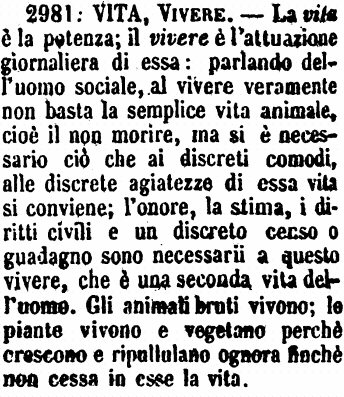 | Vita, Vivere - La vita è la potenza; il vivere è l'attuazione giornaliera di essa: parlando dell'uomo sociale, al vivere veramente non basta la semplice vita animale, cioè il non morire, ma si è necessario ciò che ai discreti comodi, alle discrete agiatezze di essa vita si conviene; l'onore, la stima, i diritti civili e un discreto censo o guadagno sono necessarii a questo vivere, che è una seconda vita dell'uomo. Gli animali bruti vivono; le piante vivono e vegetano perché crescono e ripullulano ognora finchè non cessa in esse la vita. [immagine] |