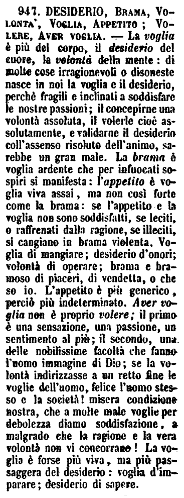 | Desiderio, Brama, Volontà, Voglia, Appetito; Volere, Aver voglia - La voglia è più del corpo, il desiderio del cuore, la volontà della mente: di molte cose irragionevoli o disoneste nasce in noi la voglia e il desiderio, perchè fragili e inclinati a soddisfare le nostre passioni; il concepirne una volontà assoluta, il volerle cioè assolutamente, e validarne il desiderio coll'assenso risoluto dell'animo, sarebbe un gran male. La brama è voglia ardente che per infuocati sospiri si manifesta: l'appetito è voglia viva assai, ma non così forte come la brama: se l'appetito e la voglia non sono soddisfatti, se leciti, o raffrenati dalla ragione, se illeciti, si cangiano in brama violenta. Voglia di mangiare; desiderio d'onori; volontà di operare; brama e bramoso di piaceri, di vendetta, o che so io. L'appetito è più generico, perciò più indeterminato. Aver voglia non è proprio volere; il primo è una sensazione, una passione, un sentimento al più; il secondo, una delle nobilissime facoltà che fanno l'uomo immagine di Dio; se la volontà indirizzasse a un retto fine le voglie dell'uomo, felice l'uomo stesso e la società! misera condizione nostra, che a molte male voglie per debolezza diamo soddisfazione, a malgrado che la ragione e la vera volontà non vi concorrano! La voglia è forse più viva, ma più passeggera del desiderio: voglia d'imparare; desiderio di sapere. [immagine] |