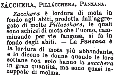 | Zacchera, Pillacchera, Panzana - Zacchera è lordura di mota in fondo agli abiti, prodotta dall'aggregato di molte Pillacchere, le quali sono schizzi di mota che l'uomo, camminando per vie fangose, si fa in fondo degli abiti. - La Panzana è la lordura di mota più abbondante, e lo dicono le donne quando le loro sottane non solo hanno la zacchera in gran quantità, ma sono quasi inzuppate di melma. [immagine] |