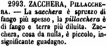 | Zacchera, Pillacchera - La zacchera è spruzzo di fango più spesso, la pillacchera è di fango e terra più diluita. Zacchera, cosa da nulla, è piccolo, insignificante guadagno. [immagine] |
